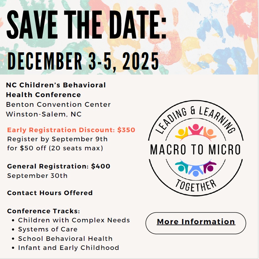 Conference Description: NC’s child behavioral health systems of care are influenced by several factors that determine both the type and quality of services provided to NC children and families. These factors include the policies that govern NC service provision; the research that informs those policies and practices; and the sociocultural challenges that impact the daily lived experiences of NC families and communities. To recognize that NC currently has a larger need for child behavioral health services than our system has the capacity to provide, means that careful attention must be paid the well-being of not just the children themselves, but also the individuals tasked with meeting their behavioral health needs.